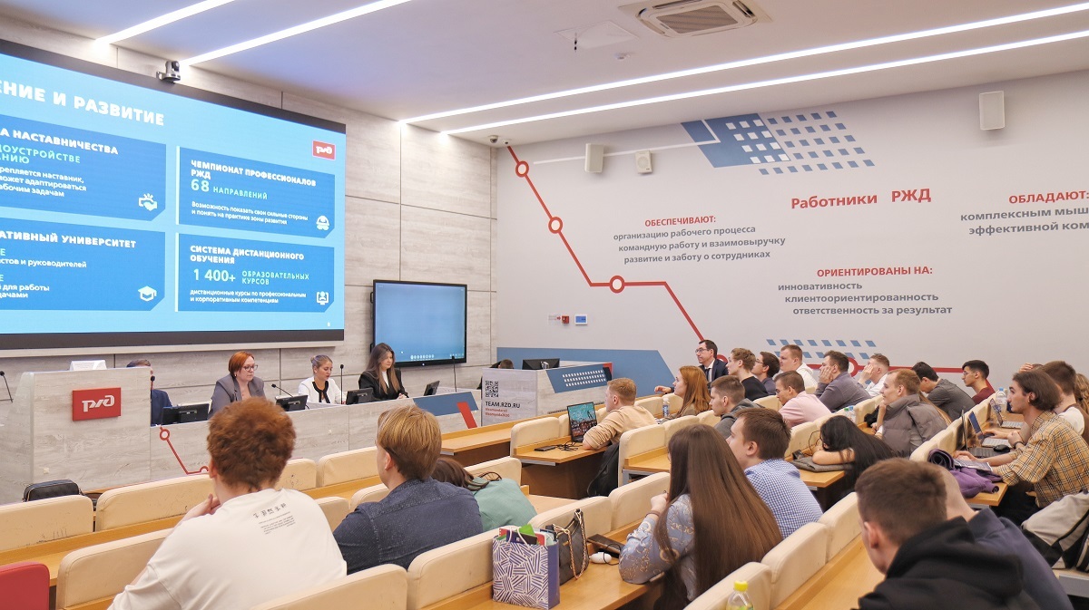 Данный формат взаимодействия стал уже традиционным. Заместитель начальника службы управления персоналом Центральной дирекции управления движением Елистратова Т.В. рассказала студентам об особенностях работы дирекции, профессиональных компетенциях и личных качествах, которыми должны обладать будущие руководители. На этот раз для разговора со студентами пришел заместитель начальника станции Москва-Пассажирская-Ярославская Илья Алексеевич Скитович, который является выпускником специальности Эксплуатация железных дорог. Илья Алексеевич рассказал о реализуемых в настоящее время новшествах в эксплуатационной работе и перспективах дальнейшего развития и карьерного роста выпускников специальности «Эксплуатация железных дорог». Начальник отдела управления персоналом Московско-Курского центра организации работы железнодорожных станций МДУД Елена Алексеевна Проценко ознакомила студентов с правами молодого специалиста, социальными гарантиями, которые предоставляет компания работникам.