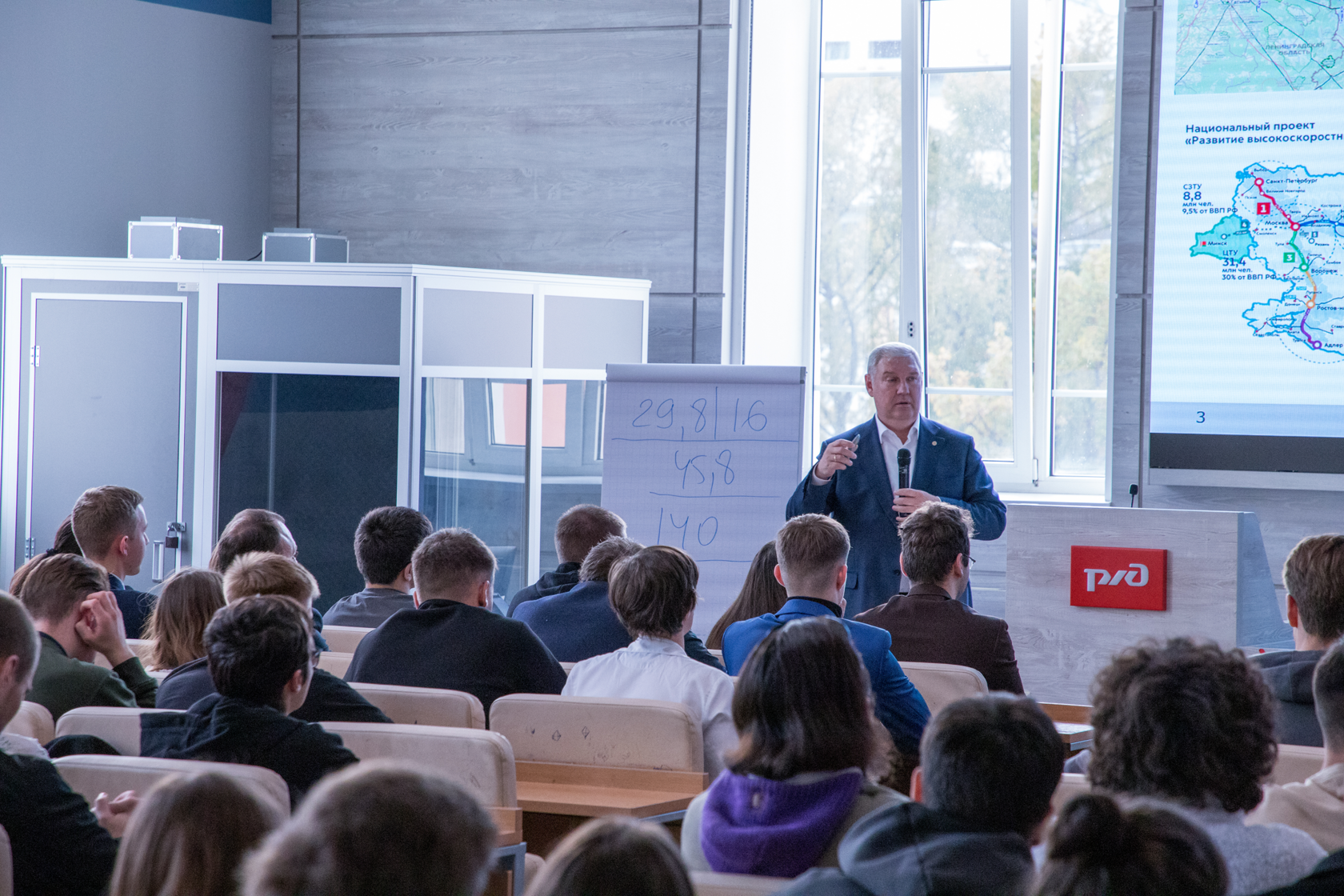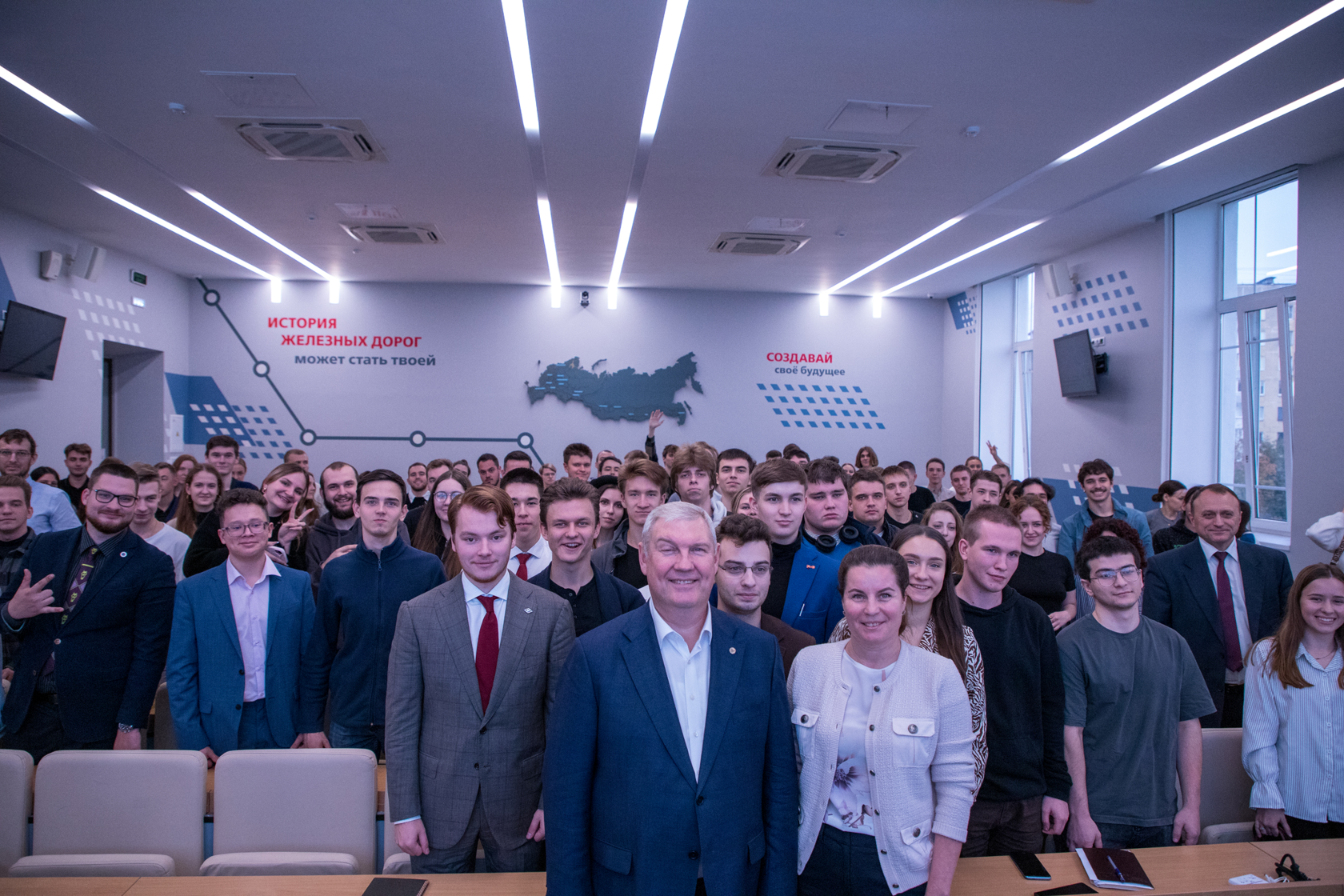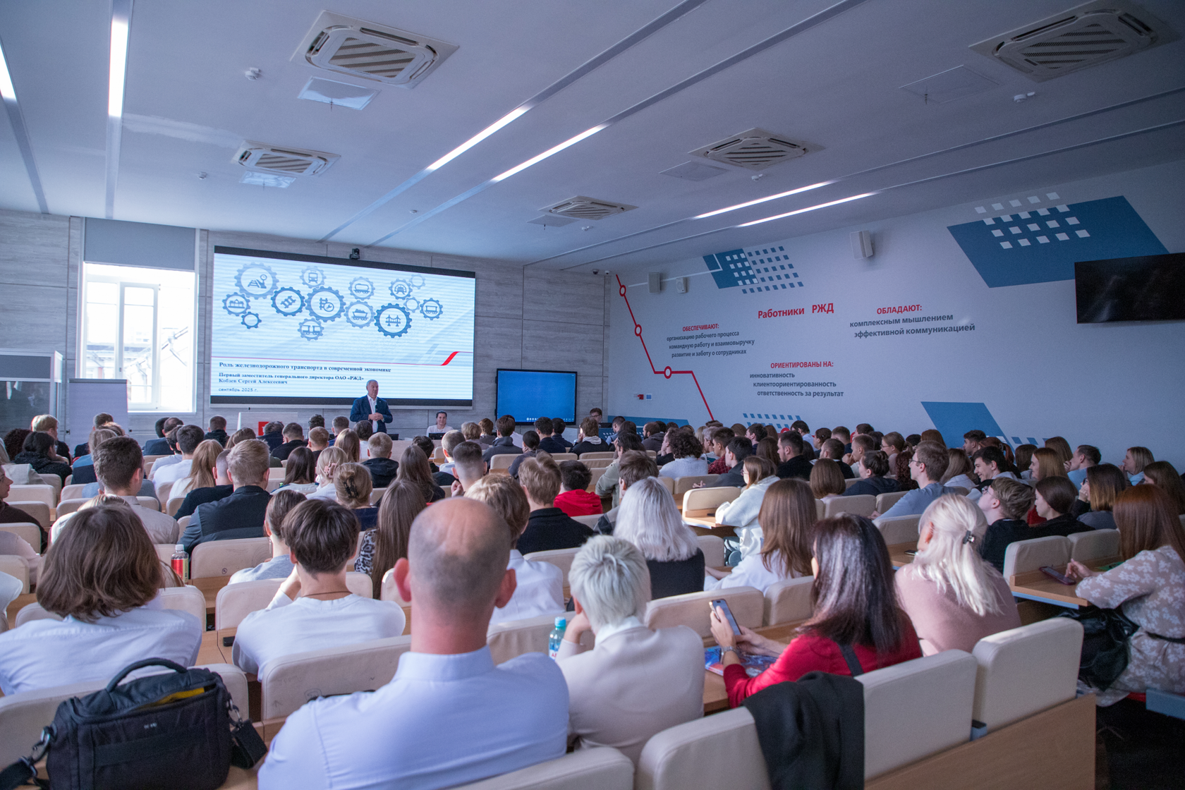 Дискуссия после лекции получилась особенно живой и содержательной. Отвечая на вопросы студентов, Сергей Алексеевич объяснил кадровую политику компании в эпоху цифровизации и упомянул актуальность проблемы избытка порожнего парка вагонов на сети.
