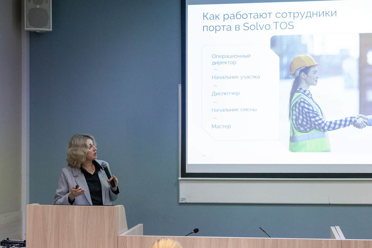 Ирина Владимировна познакомила слушателей с учебной версией системы «Solvo.TOS», которая позволяет имитировать работу контейнерного терминала порта, расстановку судов по причалам, разработку грузового плана судна, плана погрузки/разгрузки судов с заданным подъёмно-транспортным оборудованием, взаимодействие с автомобильным и железнодорожным фронтами, оформление коносамента, букинга и железнодорожной накладной.